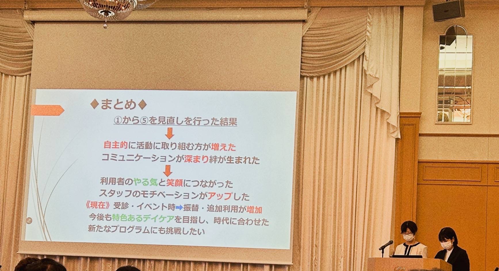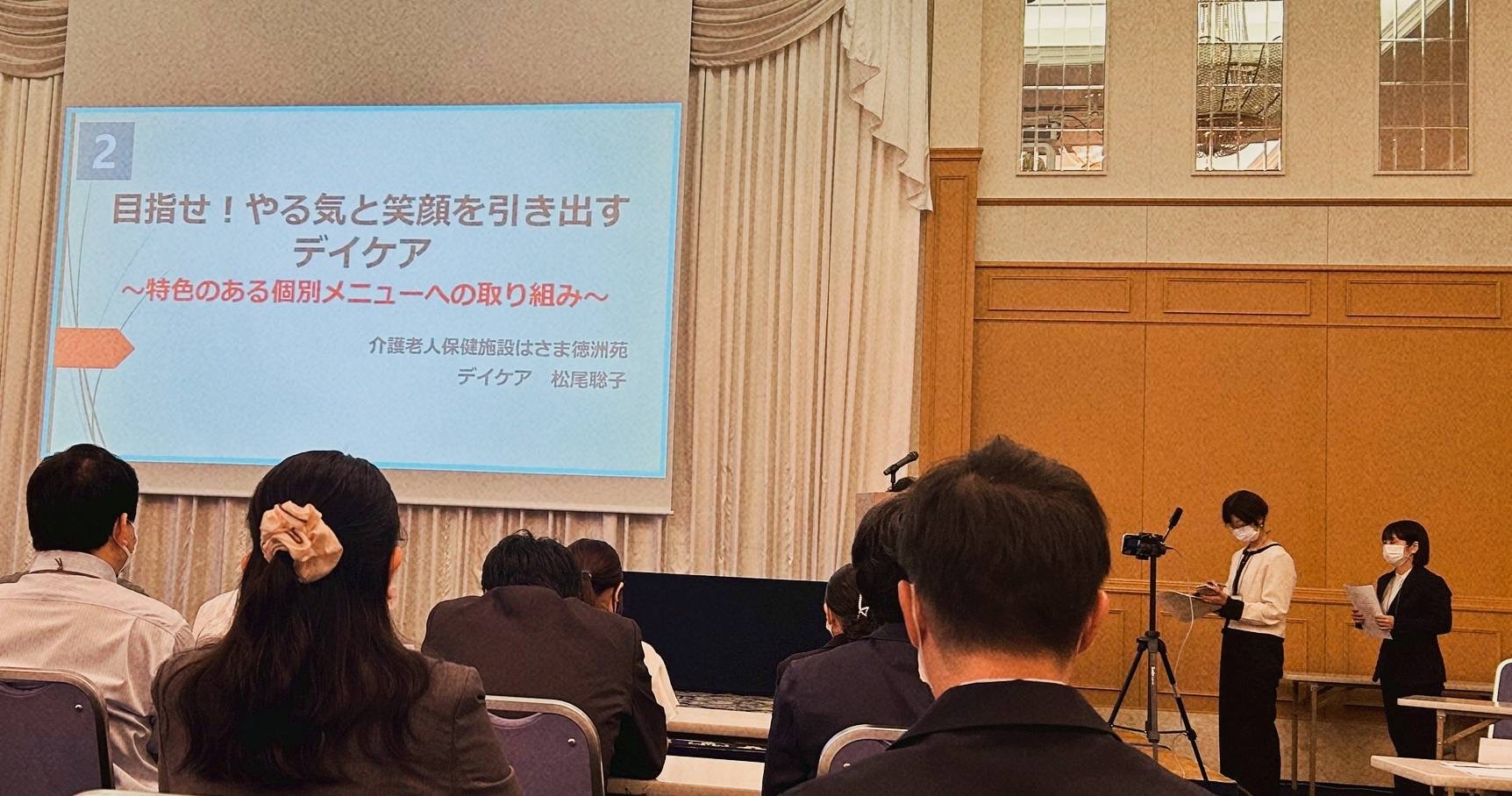 千葉県老人保健施設大会 令和7年9月26日に一般社団法人千葉県老人保健施設協会が主催する、令和7年度千葉県老人保健施設大会がホテルポートプラザちばにて開催されました。 千葉県大会には、デイケアの松尾聡子さんが演題を発表しました。 演題は「目指せ!やる気と笑顔を引き出すデイケア~特色のある個別メニューへの取り組み~」 当苑デイケアでは、コロナ禍以降感染対策などの対応により全員で行う活動や、利用者様同士のコミュニケーションが減少していました。 そこで、「特色のあるデイケア」を目指し、実際にデイケアで取り組んだ個別メニューについて発表をしました。 無事に発表が終わり、その後も各施設の方々の発表を拝聴させていただきました。 全演題の発表が終わり、その後最優秀賞・優秀賞の発表がありました。 なんと!!優秀賞を頂きました!! これまで数か月間にわたり、準備や練習を繰り返し努力をしてきた成果とともに、 デイケアでの取り組みをたくさんの方に知っていただけたことがとても嬉しかったです。 利用者様との関わりを大切に、今後も特色のあるデイケアを目指し時代に合わせたプログラムにも 挑戦していきたいと思います。